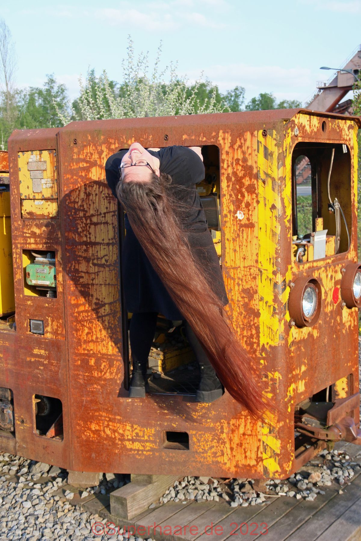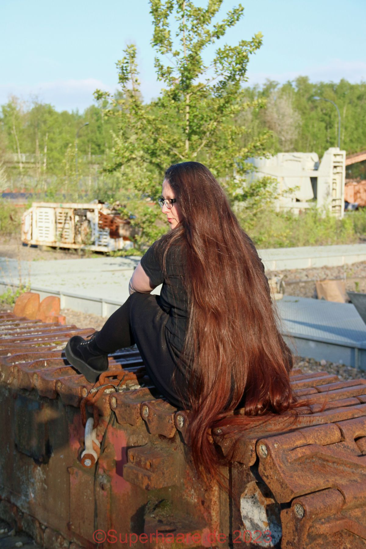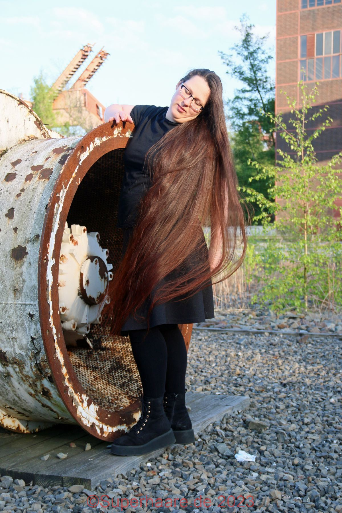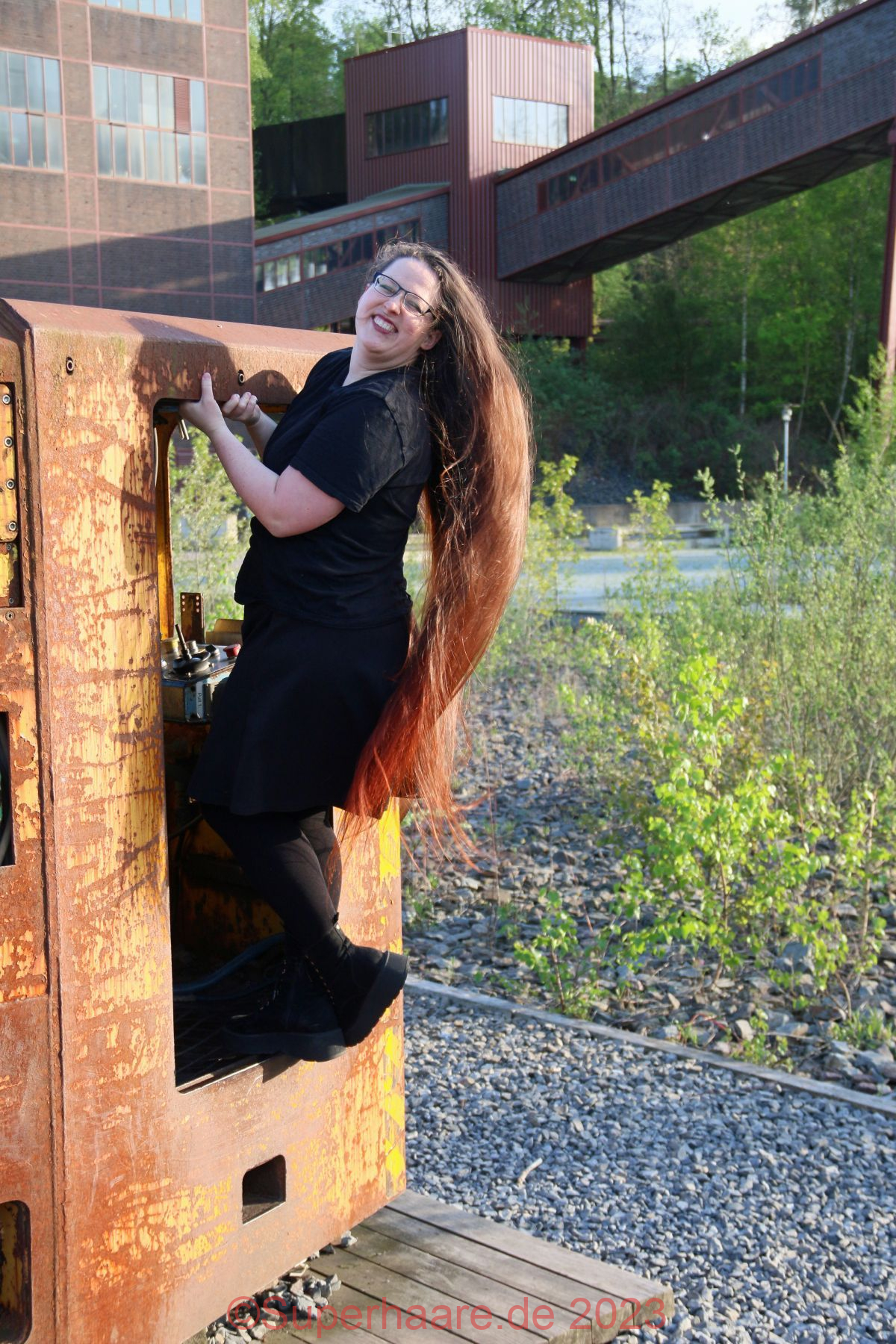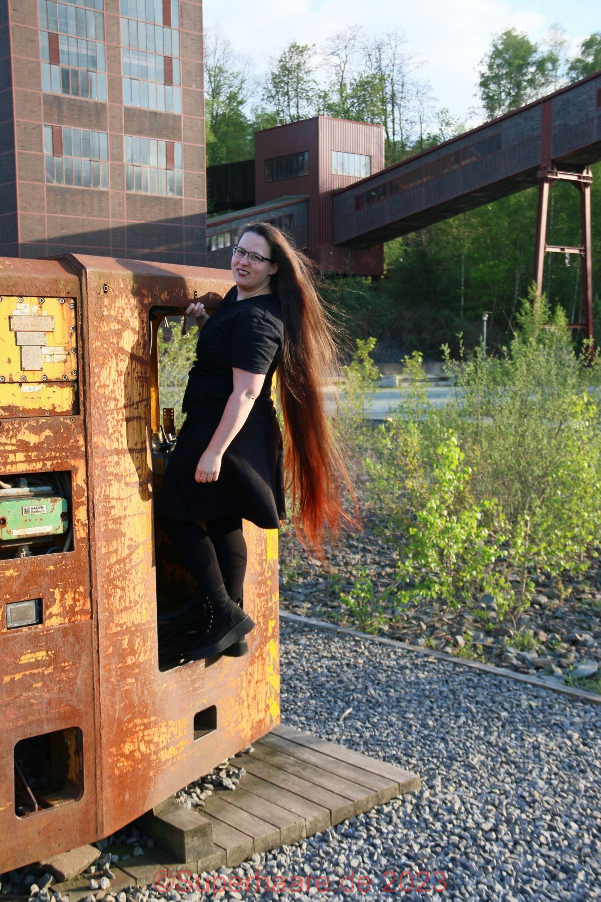 Das Shooting mit Verena war Besonders: An diesem Tag hatte ich schon mit Nadine fotografiert – im Duisburger Landschaftspark. Und nun freute ich mich auf Verena – am frühen Abend in der Zeche Zollverein in Essen. Erfreulicherweise war auf der Autobahn nur mäßiger Verkehr. Wir trafen uns an einem Parkplatz am Rand des Zechengeländes, wo altes Material ausgestellt war und nützen dieses sofort als Kulisse. Aufgrund der vorgerückten Zeit stand die Sonne bereits sehr tief, was Verenas Haare intensiv aufleuchten lies – die Bilder sind nicht farbkorrigiert!