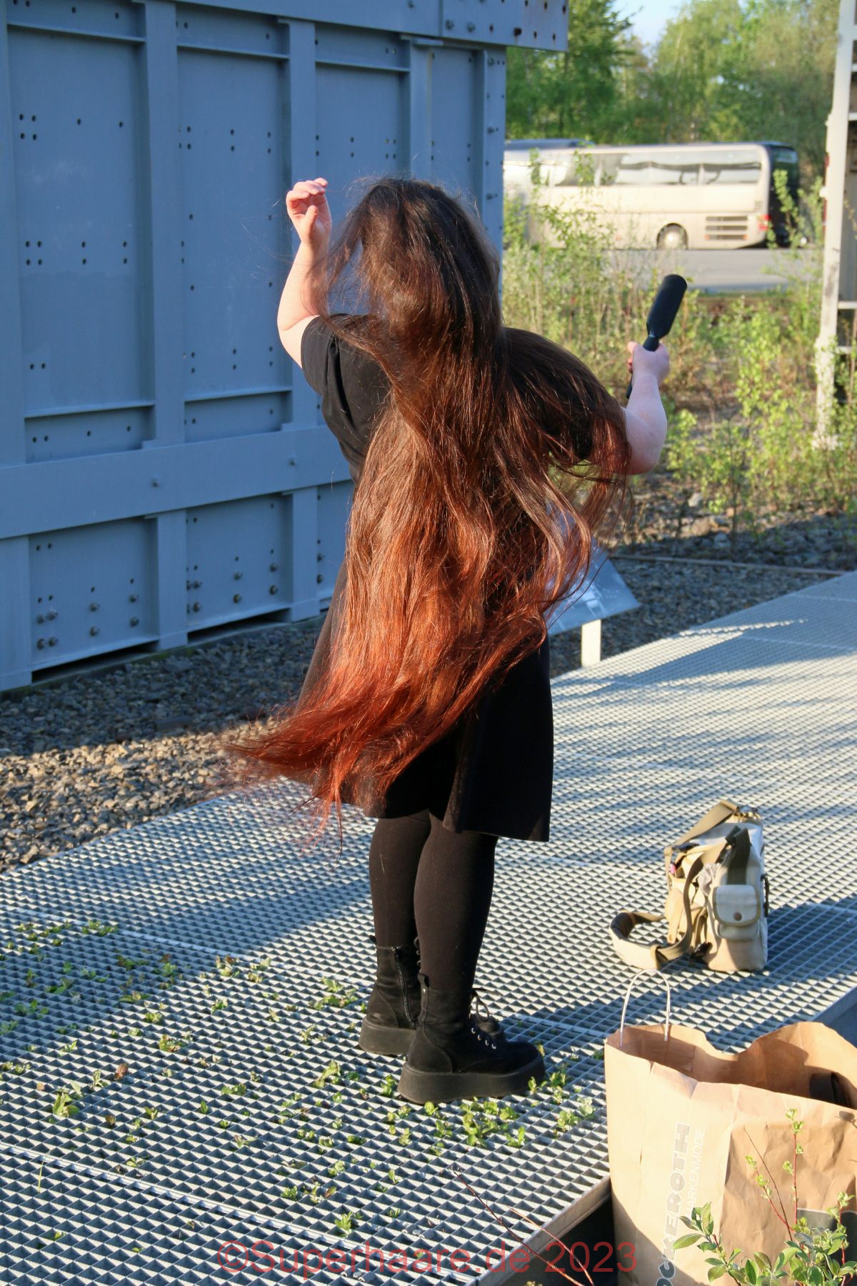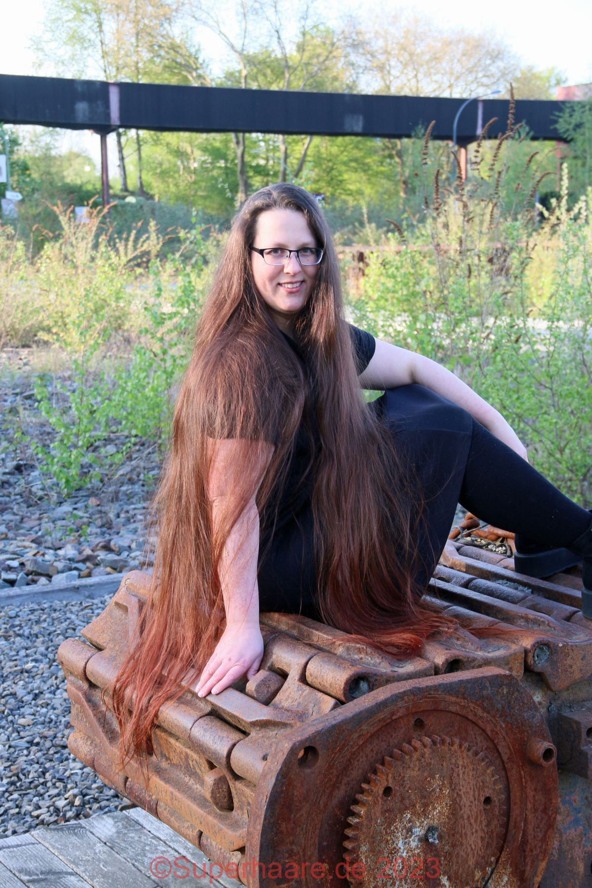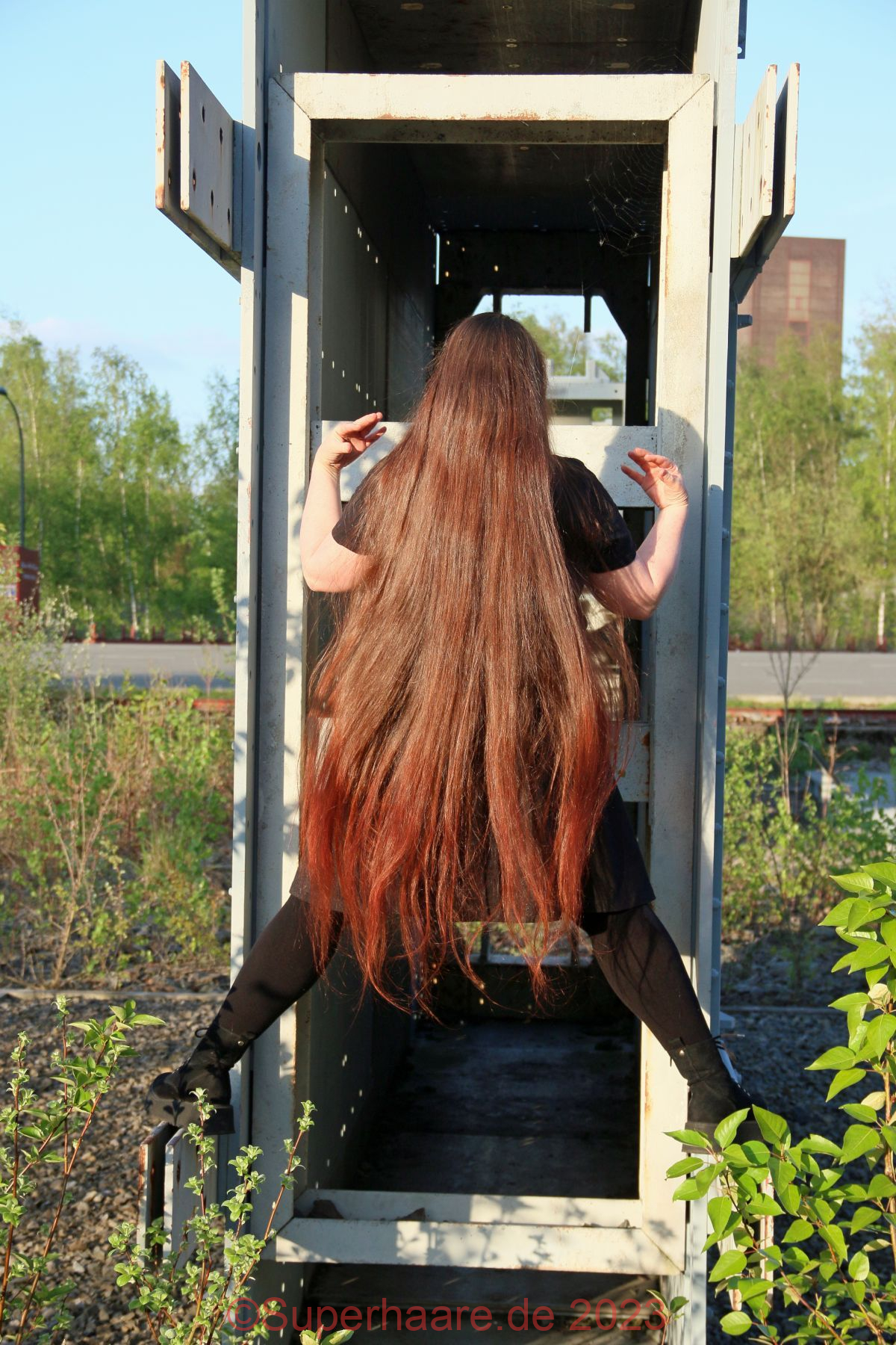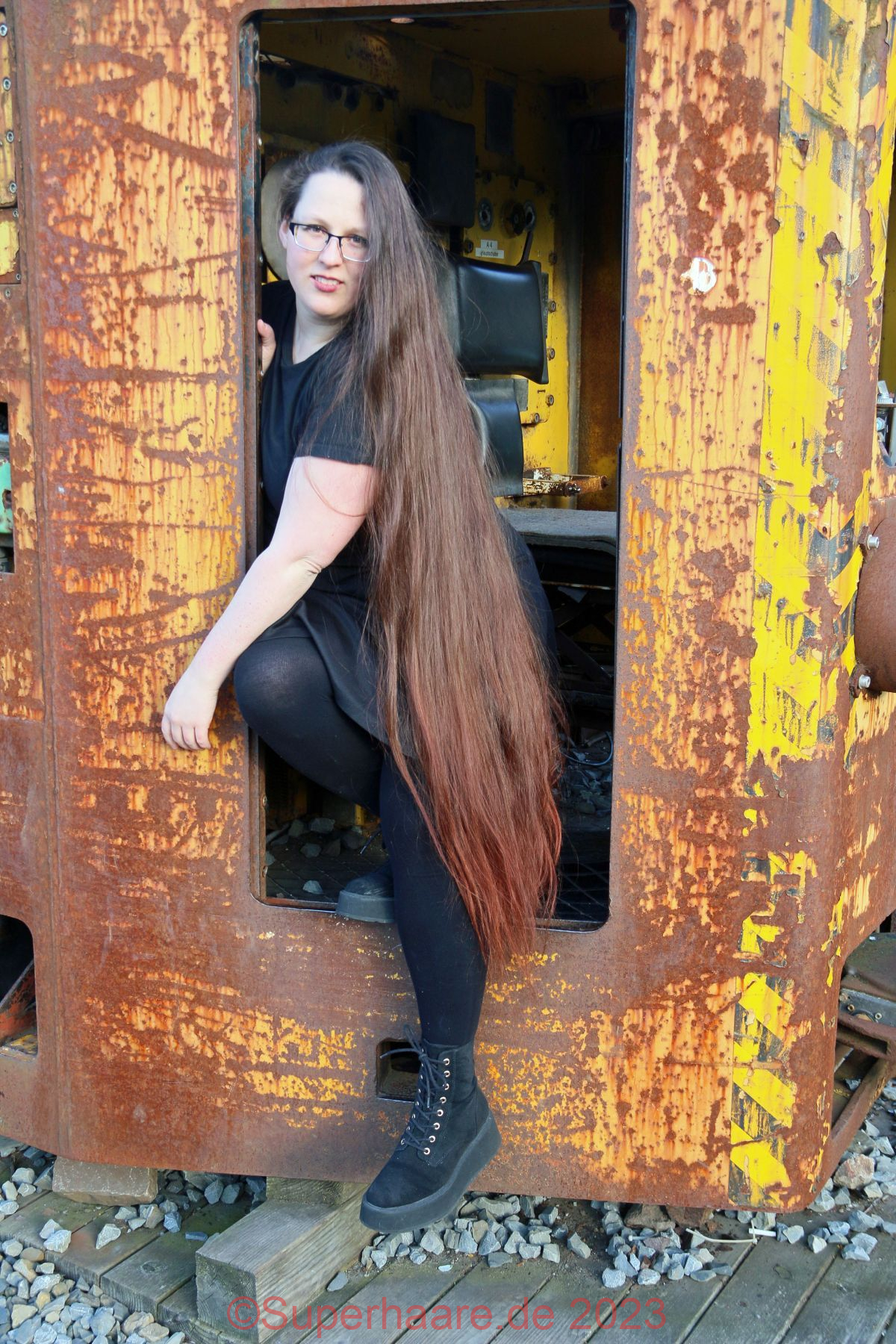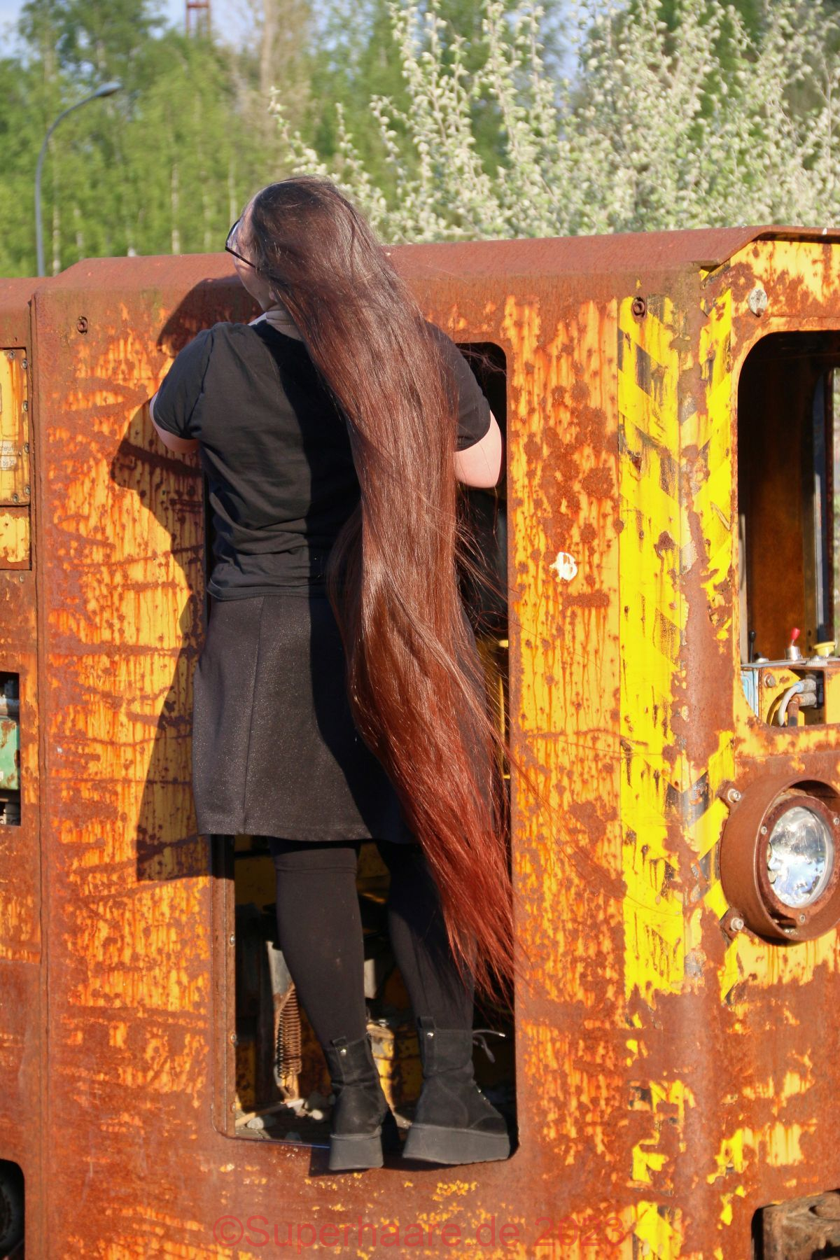 Das Shooting mit Verena war Besonders: An diesem Tag hatte ich schon mit Nadine fotografiert – im Duisburger Landschaftspark. Und nun freute ich mich auf Verena – am frühen Abend in der Zeche Zollverein in Essen. Erfreulicherweise war auf der Autobahn nur mäßiger Verkehr. Wir trafen uns an einem Parkplatz am Rand des Zechengeländes, wo altes Material ausgestellt war und nützen dieses sofort als Kulisse. Aufgrund der vorgerückten Zeit stand die Sonne bereits sehr tief, was Verenas Haare intensiv aufleuchten lies – die Bilder sind nicht farbkorrigiert!